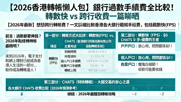 【2026香港虛擬銀行排名】8大Virtual Bank利率比較:高息活期、定存優惠一篇搞懂 2026-03-31 高息ETF香港投資教學2026:比較推介、成份股分析與月供攻略 2026-03-31 【2026最新】HSBC手續費一覽:一篇搞懂HSBC One戶口收費、匯款、海外提款費用 2026-03-31 【2026收息股邊隻最穩?】精選10隻香港穩健收息股,一篇學識建立低風險高息組合! 2026-03-31 【香港銀行定存利率比較2026】20+間銀行優惠:定期存款邊間銀行最高息?(附新資金教學) 2026-03-31 稅務計算幫你一站式計算所有關於稅才務問题 股票新手指南從零開始學投資,股票、ETF、基金一步到位 平台收費解析富途、老虎、盈透平台收費與功能全面比較 貸款產品攻略匯集多種類型的貸款方案輕鬆解決資金周轉 銀行優惠情報最新開戶優惠、存款利率、轉帳收費一次看清 保險選擇指南醫療、旅遊、重疾保障逐個拆解,精明選擇保險 置業退休攻略強積金、年金、買樓與裝修全方位財務規劃 旅遊消費情報平機票、酒店優惠、日常慳錢貼士全收錄 熱門資訊 觀看全部 銀行保險箱比較|香港各大銀行保險箱服務收費、尺寸與配額一覽2025-08-01在香港,選擇銀行保險箱作為保管貴重財物與重要文件的方式依然相當普遍。不過,隨着需求增加與配額有限,保...HSBC派息懶人包2026:滙豐控股(00005)股息發放日、除淨日及紀錄全攻略2025-12-30想查詢HSBC(00005)最新派息詳情?本篇滙豐派息懶人包為您整合了2026年股息發放日、除淨日、...匯豐信用卡交稅2026全攻略:網上/App繳稅教學、回贈優惠與常見問題2025-09-04想知道如何使用匯豐信用卡交稅賺盡回贈?本文提供最新匯豐信用卡交稅方法,詳解網上銀行及理財App操作步...機管局債券認購全攻略:4.25厘高息對比iBond、銀債值博率?專家拆解申請流程與風險2025-08-29機管局債券認購懶人包,一文看清4.25厘年息的吸引力。本文為您深入分析機管局債券的申請方法、派息時間...實金去邊度買?2025香港買金條/金粒終極指南(附4大渠道比較)2025-11-06想知實金去邊度買最穩陣?本文為您完整解析香港4大買金渠道:金舖、銀行、金行及二手市場,詳細比較買賣差... 「講經MAN」-YouTube頻道 恒生高息股 30 指數 ETF(3466.HK)好唔好?拆解成分股+風險+優勢!|收息股必睇! Covered Call ETF 3416.HK 年收16厘?!收息股必睇:與3110/3466邊隻更抵揸? 南方東英 2802 大戰 3416|$880入場收17%高息?挑戰 3416 一哥地位!國指Covered Call ETF詳盡比較(收息股必睇) 進入 YouTube 頻道 政經·港經 高息ETF香港投資教學2026:比較推介、成份股分析與月供攻略 >> 【2026收息股邊隻最穩?】精選10隻香港穩健收息股,一篇學識建立低風險高息組合! >> 【2026香港REITs懶人包】11隻房託基金排名,REITs派息比較全攻略! >> 匯豐派息日期2026懶人包:一篇搞懂0005派息時間表、股息預測與股價關係 >> 理財資訊置業安居信用卡旅遊專區 2026國際財經新聞|一篇搞懂環球金融市場動態與美股走勢分析 2026-03-23 想掌握2026年最新投資風向?本文為您一站式解讀國際財經新聞,深入剖析環球金融市場動態,並提供專業的美股走勢分析,助您洞悉利率政策、地緣政治風險與AI科技股前景,做出精明決策。 閱讀更多 【2026香港財經雜誌推薦】TOP 5投資理財月刊深度比較,新手入門必讀! 2026-03-23 【2026香港財經雜誌推薦】想提升投資視野?本文為您深度比較《經濟一週》、《iMoney》等5大熱門投資理財月刊,從內容、優劣到選擇標準全面分析,助您輕鬆找到最適合的財經雜誌,是新手入門必讀指南。 閱讀更多 【財政預算案2026派糖懶人包】退稅$3000!薪俸稅/差餉寬減/福利金全覽,消費券派唔派? 2026-03-11 想知2026年財政預算案派糖有幾多?本文為你整合最新薪俸稅及個人入息課稅退稅$3,000、差餉寬減、雙糧福利金等惠民措施。即睇你是否受惠,並了解今年不再派發消費券的原因。 閱讀更多 居屋禁售期2026終極指南:一篇搞懂15、10、5年限制+補地價及出售流程 2026-02-10 想賣居屋但被禁售期卡住?本文為您提供2026年最新居屋轉讓限制資訊,詳細解析15年、10年及5年禁售期分別,並整合補地價計算方法、公開市場與第二市場出售流程,助您輕鬆掌握賣樓關鍵。 閱讀更多 房協公屋懶人包2026:一篇搞懂申請資格、租金、與房委會公屋有何分別? 2026-02-06 想申請房協公屋?本文為你提供2026年最新懶人包,詳細解析房協公屋的申請資格、入息資產限額、屋邨名單,並深入比較房協與房委會公屋的根本分別,讓你一篇看懂如何申請被譽為「公屋界豪宅」的房協公屋。 閱讀更多 香港工程顧問公司排名2026:官方名單、頂尖公司比較及選擇攻略 2026-02-03 想知道最新的香港工程顧問公司排名?本文為您深度解析屋宇署官方名單,比較Arup、WSP等頂尖公司,並提供強制驗樓、小型工程的選擇攻略,助您輕鬆找到可靠夥伴。 閱讀更多 【2026最新】信用卡交稅分期5大著數攻略!一篇睇清手續費、現金回贈及銀行優惠 2026-03-31 想知2026年信用卡交稅分期點先最著數?本文為您全面比較HSBC、恒生、中銀、渣打等銀行分期計劃的手續費、現金回贈及實際年利率(APR),助您輕鬆選擇最佳方案,慳錢兼賺盡獎賞。 閱讀更多 【恒生信用卡交稅回贈2026】賺盡$1500回贈全攻略 (附e-Banking教學及分期玩法) 2026-03-31 想賺盡2026年恒生信用卡交稅回贈?本文為你整合最新優惠,詳解高達$1500 +FUN Dollars/yuu積分回贈條件、登記方法、簽賬分期攻略,並附上清晰的e-Banking交